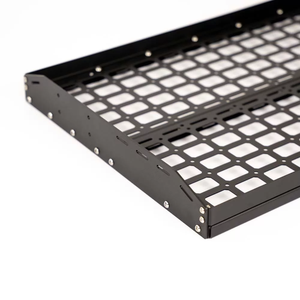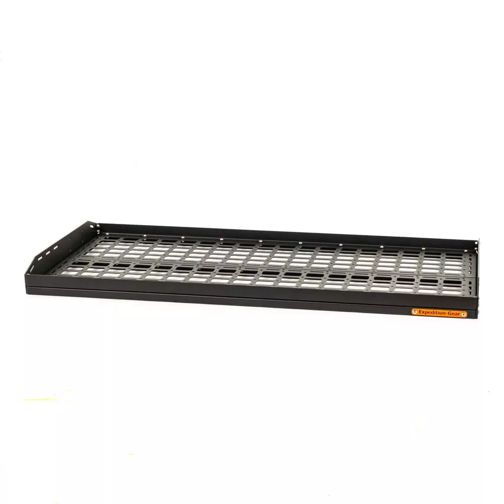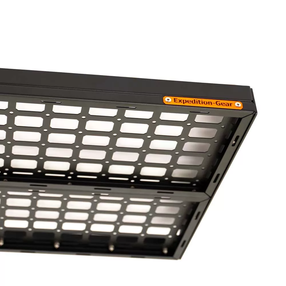 The folded edges of the metal mesh prevent the transported 4x4 equipment from falling. Designed holes on the sides of the mounts cargo shelf, make it possible to adjust the height position. Expedition shelf installs in the rear of your Jeep Wrangler above your line of sight in the rear view mirror.