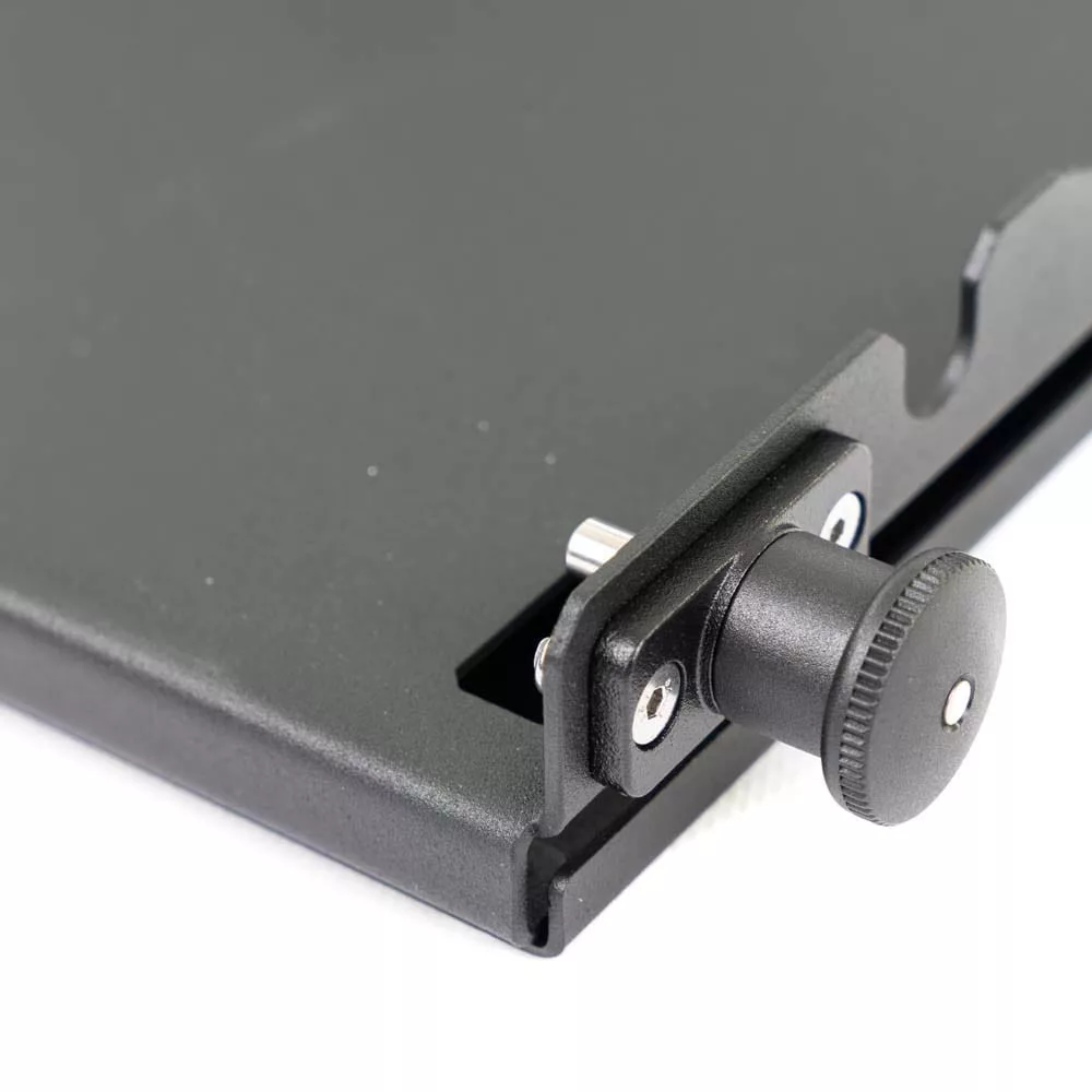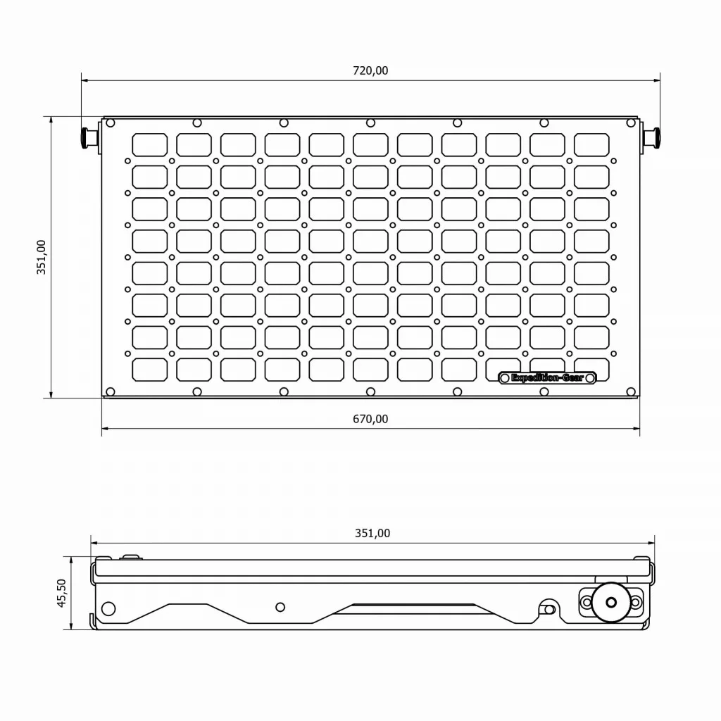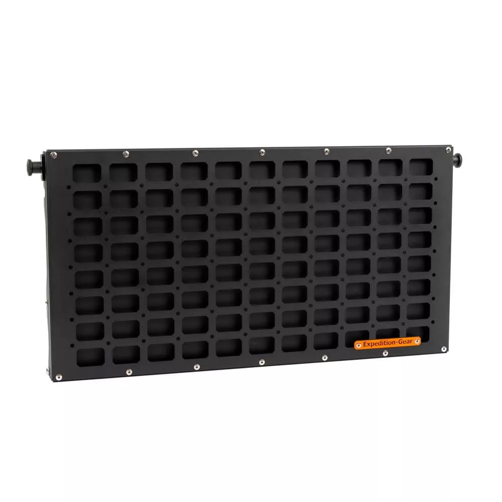 The rear door shelf can be used in the form of a traditional folded table as well as a base for mounting additional accessories, organizers or bags (attached to the table). Compatible with the military MOLLE/PALS system. Tailgate table has a number of holes to which Quick-Fist / Fit-Rub clamps can be screwed. The spacing of the holes is standardized in all our products, thanks to which our other accessories (fire extinguisher mount, bottle opener and others) can be screwed.