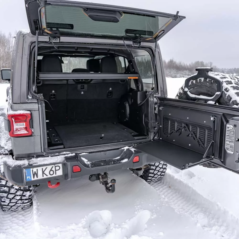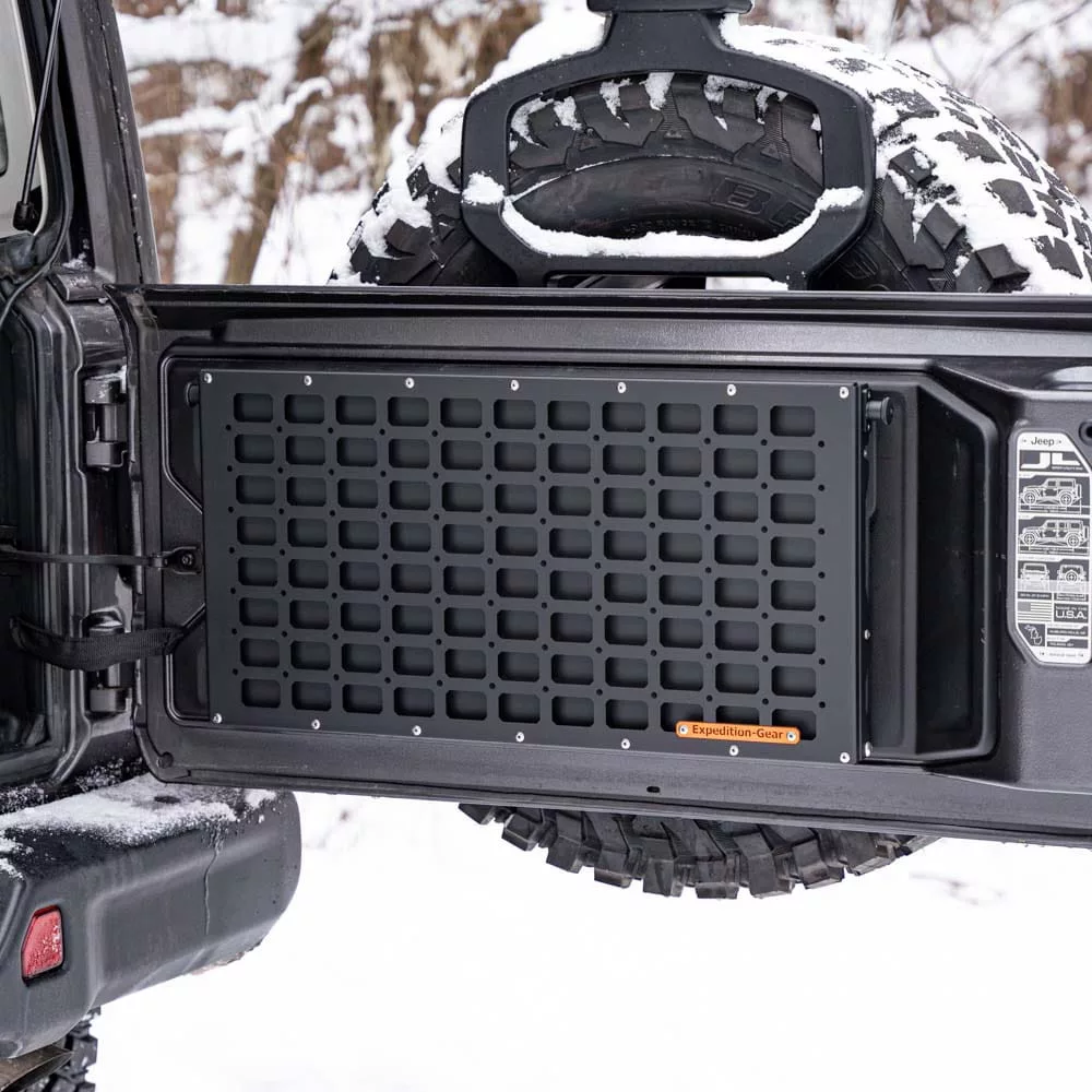 The Expedition-Gear tailgate shelf is designed to be installed in the Jeep Wrangler JL / JLU. The offroad table fits to the factory holes. You need drill two holes in stock interior tailgate cover. Perfect fit makes our camping gear one of the best on the market.