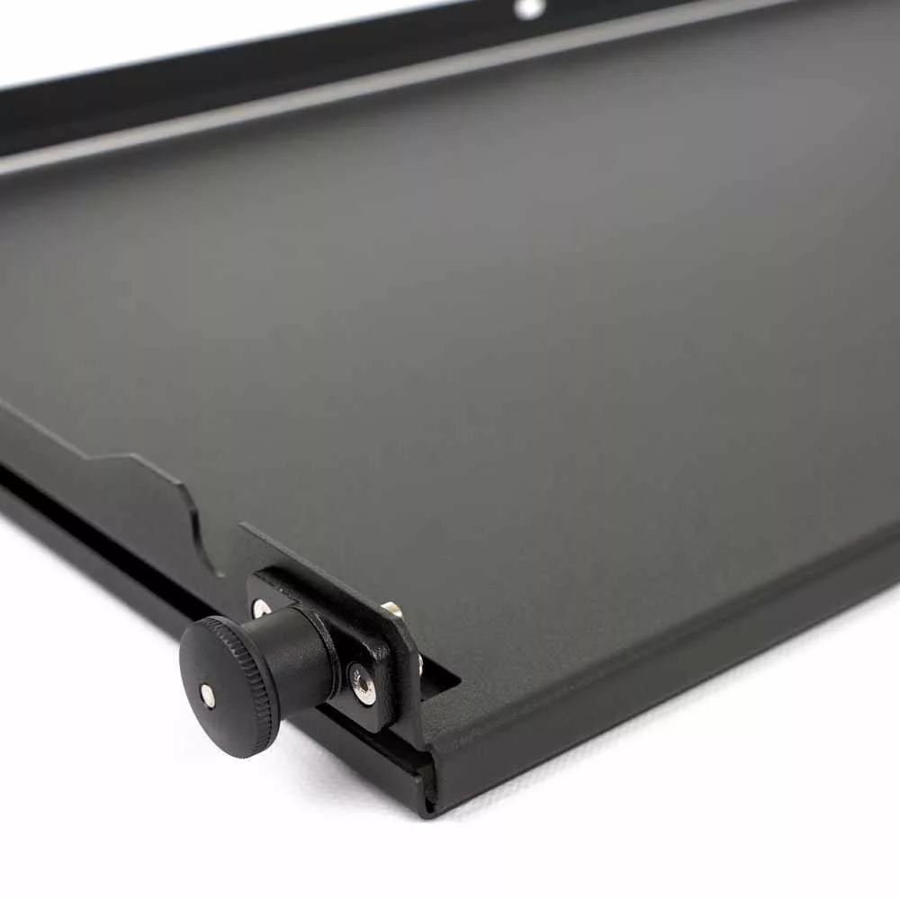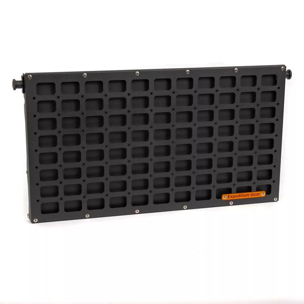 The rear door shelf can be used in the form of a traditional folded table as well as a base for mounting additional accessories, organizers or bags (attached to the table). Compatible with the military MOLLE/PALS system. Offroad tailgate table has a number of holes to which Quick-Fist / Fit-Rub clamps can be screwed. The spacing of the holes is standardized in all our products, thanks to which our other accessories (fire extinguisher mount, bottle opener and others) can be screwed.