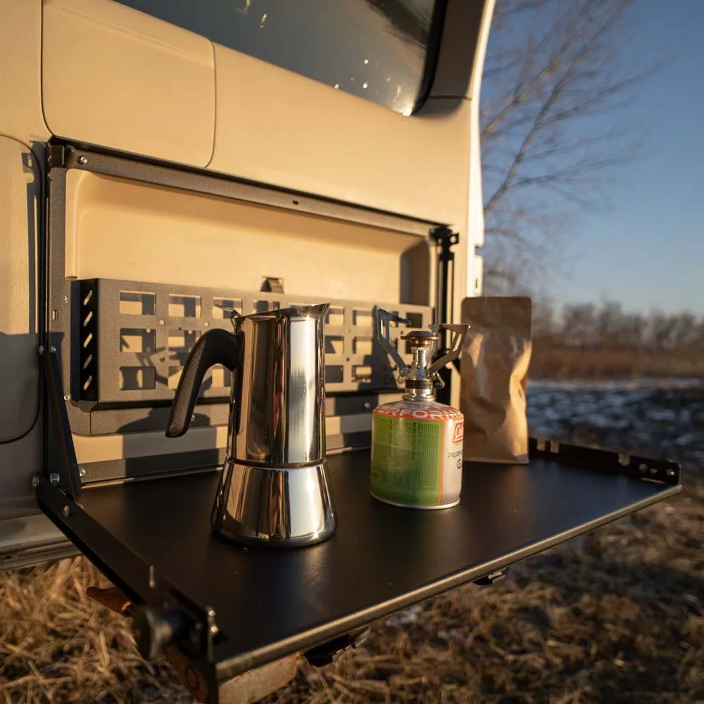 Drop down tailgate table fits rear swing opening door. The door table is a must have gear for your 4x4. Useful during expedition, offroad trips or daily use. It will work during food prep, work, or coffe making on camping.