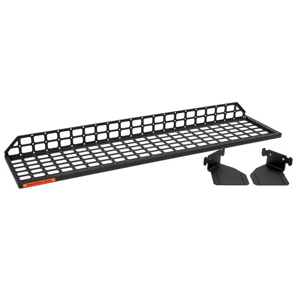 The folded edges of the metal mesh prevent the transported 4x4 equipment from falling. The high front wal lis an additional base for mounting accessories, e.g. flashlight or fire extinguisher. Designed holes on the sides of the mounts cargo shelf, make it possible to adjust the height position. Expedition shelf installs in the rear of your Jeep Wrangler above your line of sight in the rear view mirror. The design of the shelf prevents vibrations and sounds while driving.