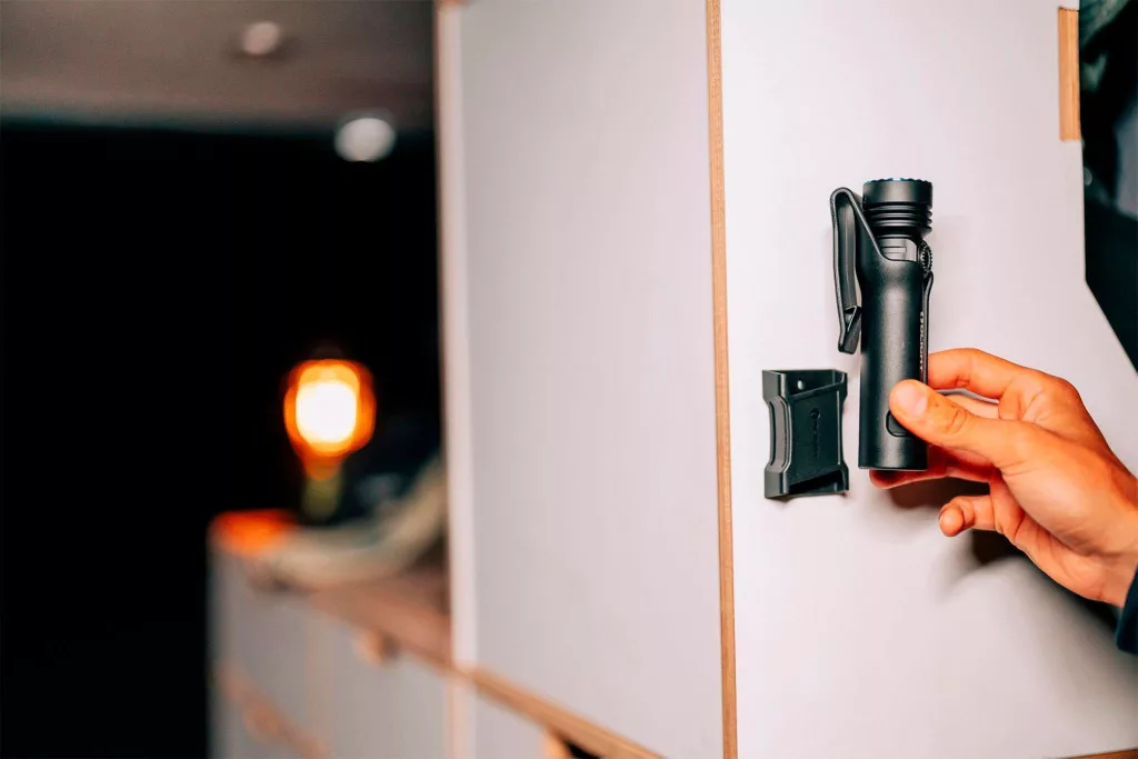The lamp is supplied with a completely new and multi-purpose belt case, which connects the light to the key lock every time the lamp is placed in it, and also switches the key lock off when the light is taken out of the case. If the lamp is placed in the housing while it is on, the light output automatically drops below 600 lumens, so that the high light energy produced by the lamp does not cause damage to nearby clothes, for example. In addition, the case works as a charging dock, and the light is also supplied with a convenient wall bracket, to which the belt case can be slid, for example during storage or charging. Seeker 4 Pro works with one 21700 li-ion battery (included), which, as usual for Olight, can be charged directly inside the lamp via the lamp's magnetic end cap with the MCC3 charging cable. The battery can also be charged with the USB-C charging cable by placing the lamp in the belt holster. Either way, charging is quick and effortless, and the status of the battery charge can be monitored from the indicators next to the switch. Five-year (60 months) warranty!