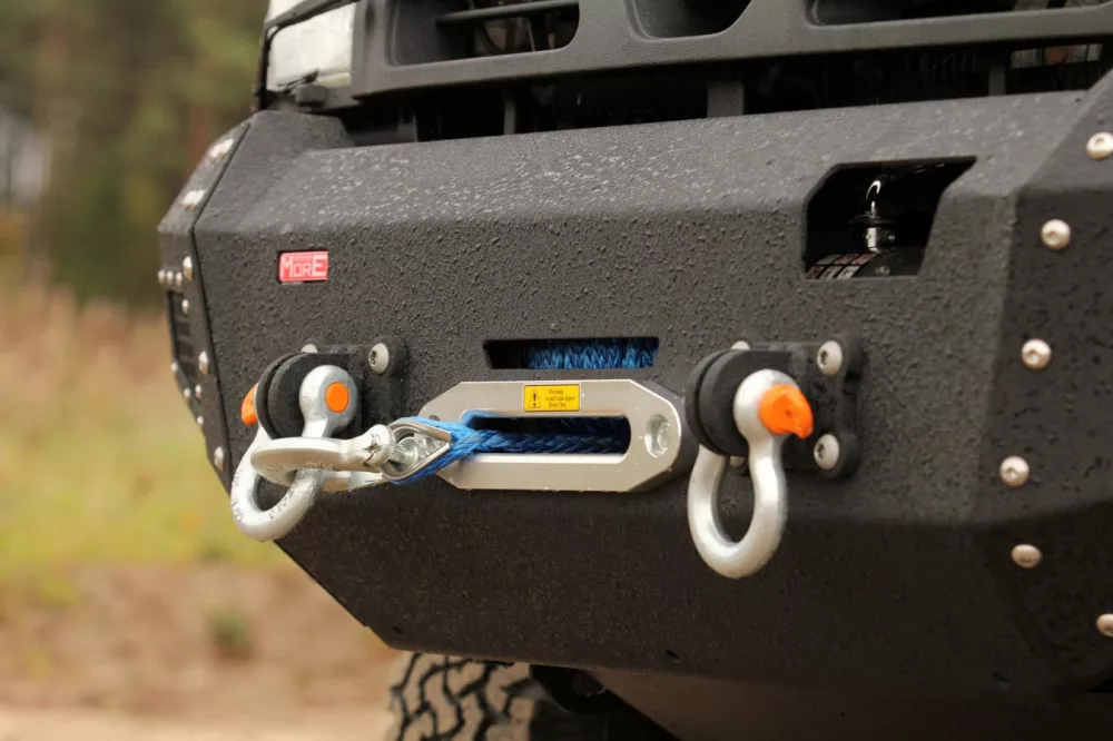 The bumper has two built-in daylight or fog lamp holders, reinforced mounts for shackle holders and a winch mounting plate, which is standard equipment on all MorE 4x4 front bumpers.