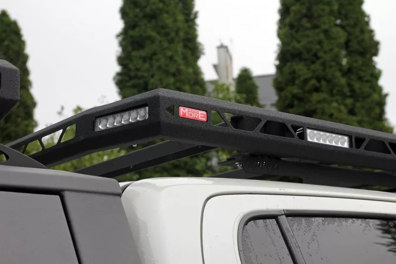 At the front of the roof rack, there is a mounting location for the vehicle's front lighting in the form of long-distance halogen lamps that can be mounted under the gear rack or LED panels of the size matching the gear rack opening, with dimensions of 540x50 mm (dedicated panels: Wesem-link, 4wd-link). The included panel hole cover allows for the use of the rack without front lighting. Within the rear and side sections of the roof rack, there are also places for securing four separate work lights (BA006). This solution protects the lights and their installation from mechanical damage.