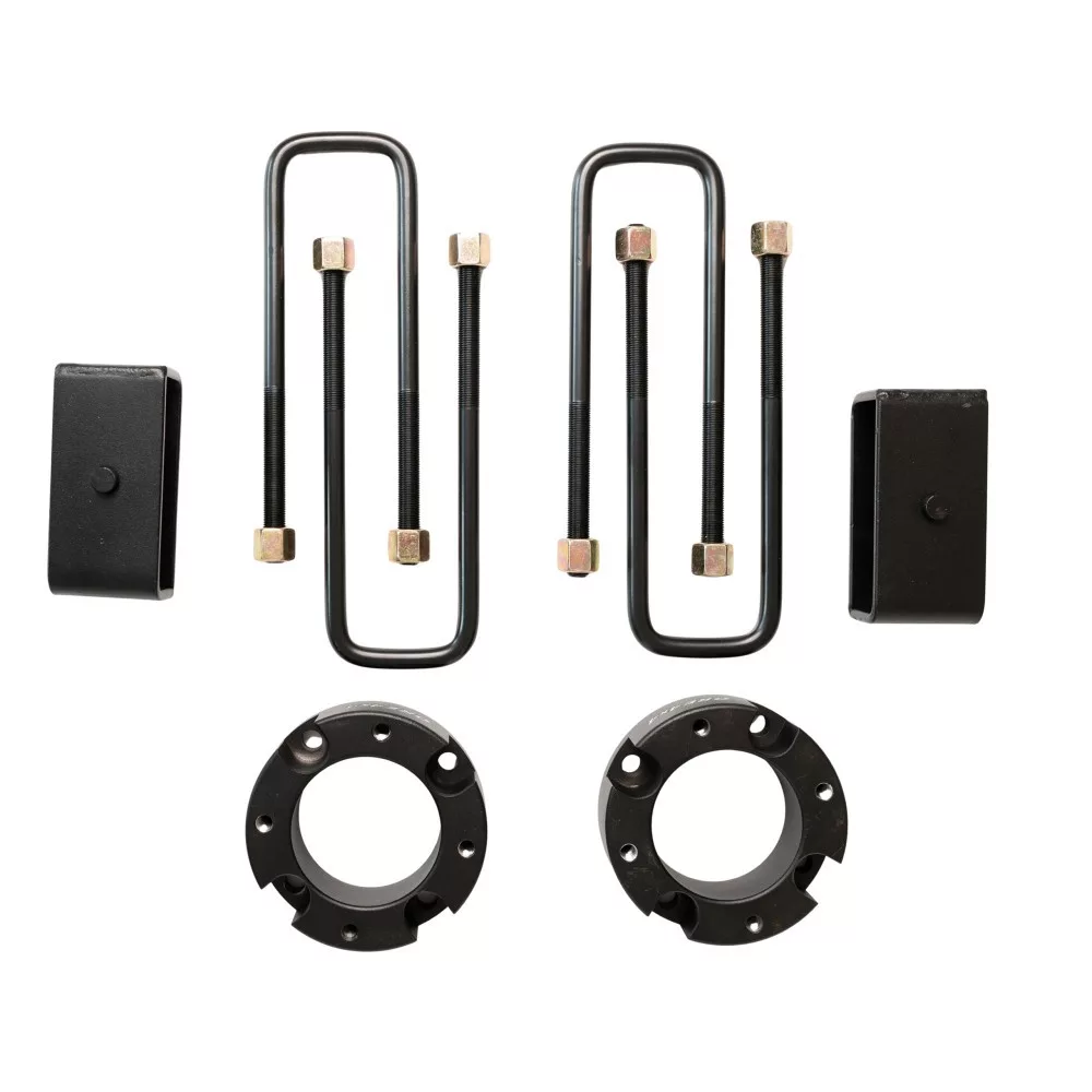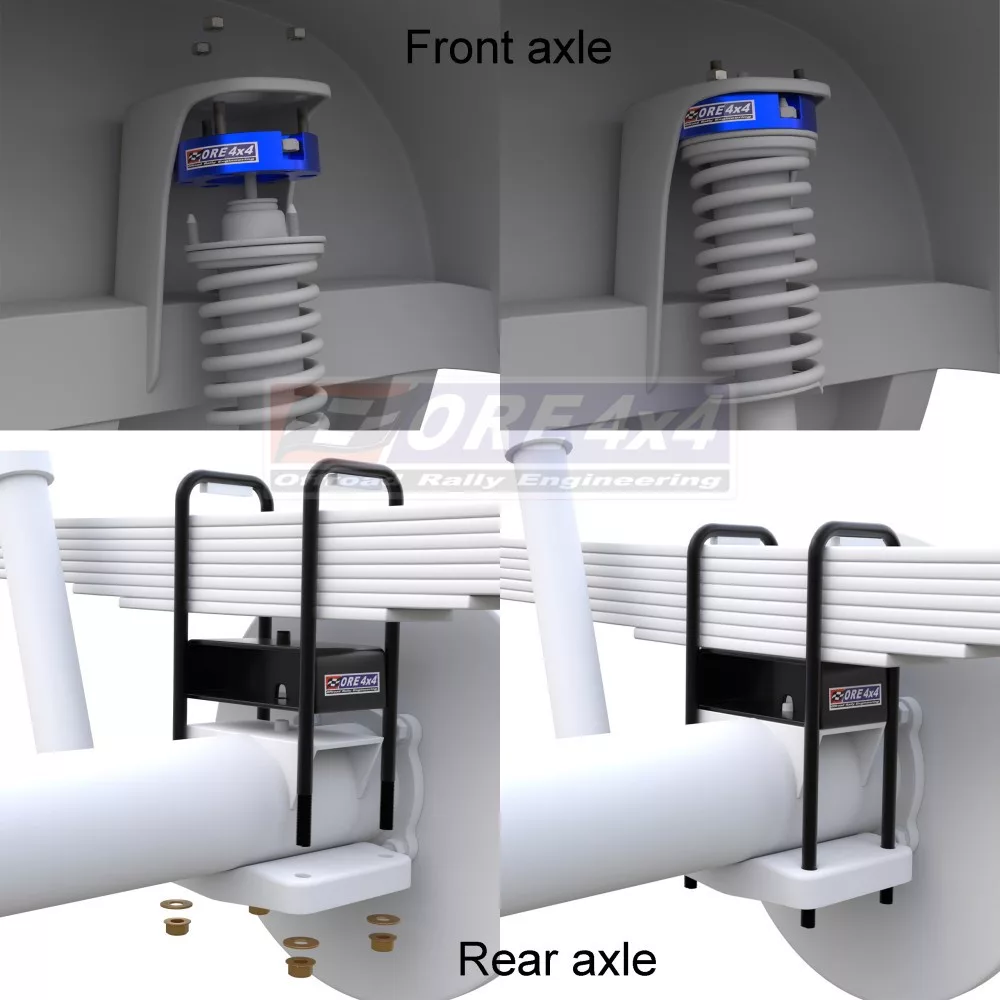 The kit includes front strut spacers and rear steel leaf spring blocks with extended U-bolts. The lift enhances ground clearance as well as approach and departure angles, while maintaining factory suspension geometry. It does not affect suspension stiffness or ride characteristics, ensuring stable and predictable handling on paved roads.