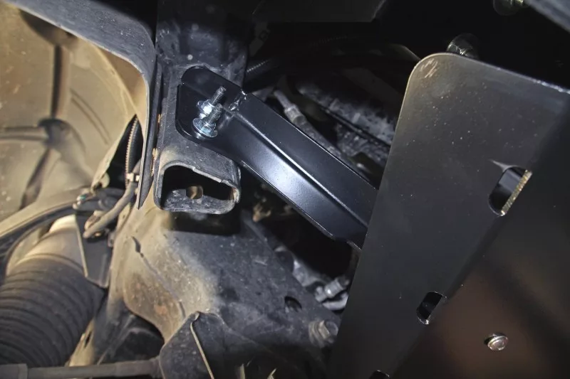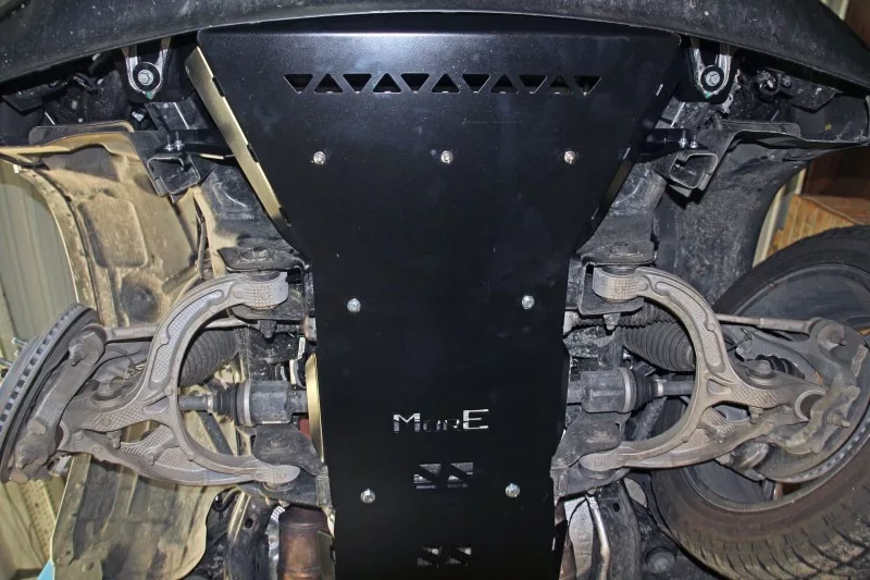 The skid plate is made of 4 mm steel. With the cover there is a set of mounting screws provided using the factory holes and threads in the vehicle frame. The steel covers are painted with two layers of black powder paint.