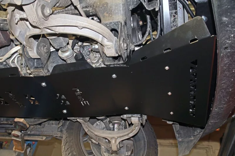 The skid plate is made of 6 mm aluminium. With the cover there is a set of mounting screws provided using the factory holes and threads in the vehicle frame. The steel covers are painted with two layers of black powder paint.
