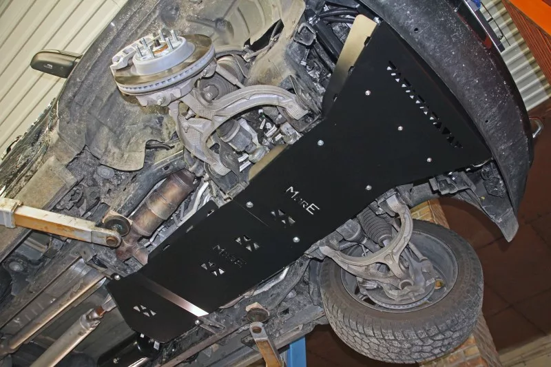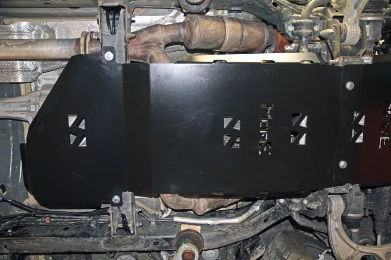 The skid plate is made of 6 mm aluminium. With the cover there is a set of mounting screws provided using the factory holes and threads in the vehicle frame. The steel covers are painted with two layers of black powder paint.