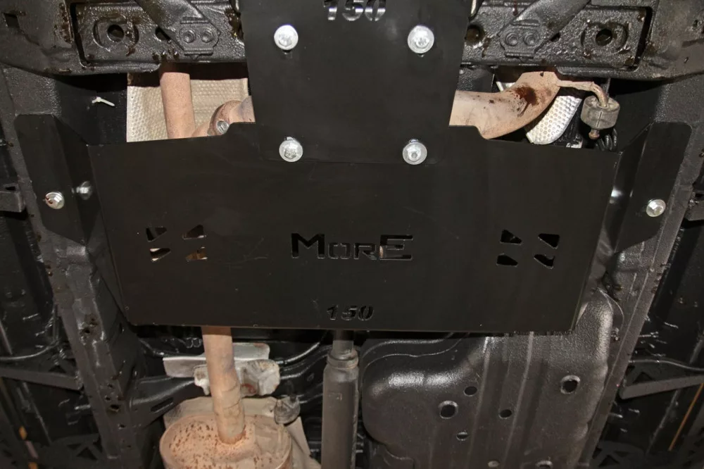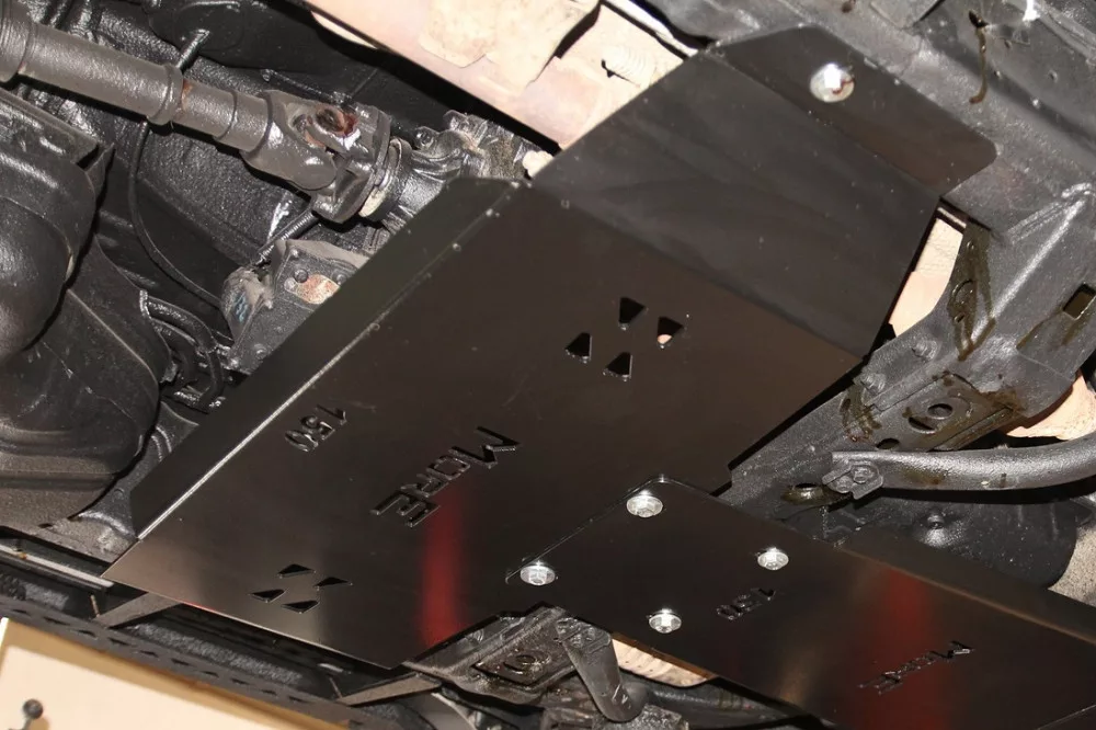 The skid plate is made of 4 mm steel. With the cover there is a set of mounting screws provided using the factory holes and threads in the vehicle frame. The steel covers are painted with two layers of black powder paint.
