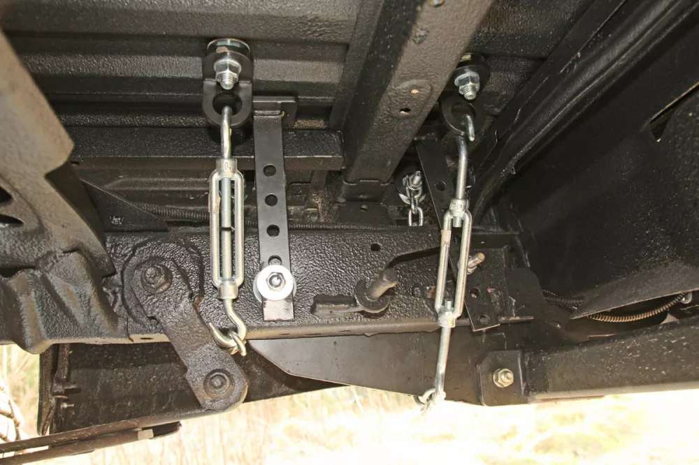 The frame struts and lashing chains supplied with turnbuckles are necessary due to the poor structure of the vehicle pit floor and the need to stiffen it.
