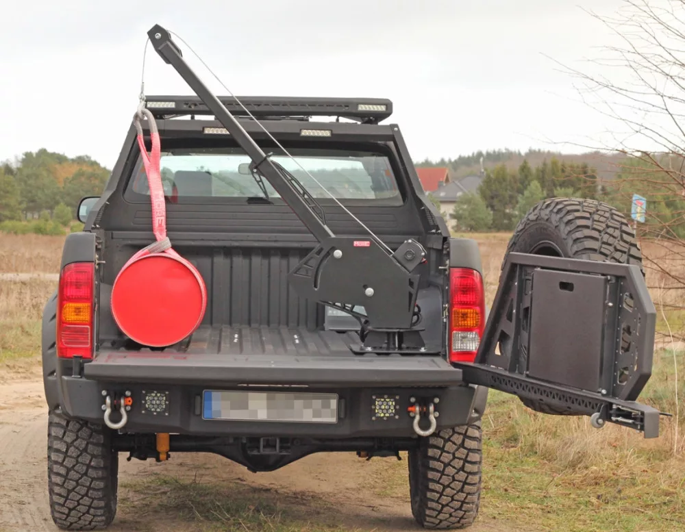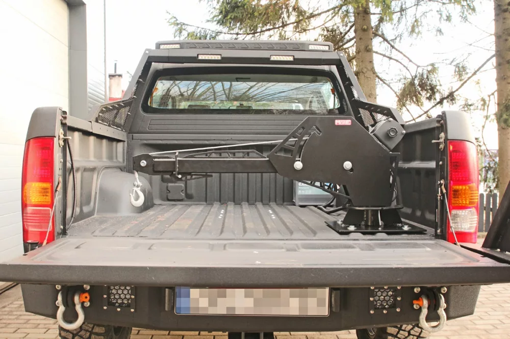 Maximum lifting capacity of 150 kg due to the strength of the pickup truck's floor. The structure is made of steel from 4 to 6 mm, powder coated in black.
