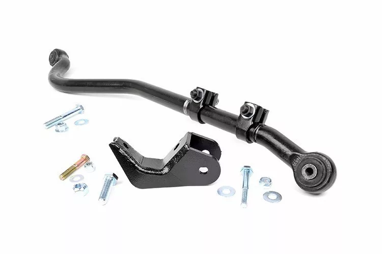 Forged, adjustable track bar from Rough Country is nearly twice the weight of your factory track bar, offering you unparalleled support and the ultimate peace of mind in any driving situation. For those who are serious about flexing, crawling, and pushing your lifted Jeep to the limits, this track bar is a must. This new track bar is made of forged steel and features rubber Clevite bushings and a beefy construction that will dwarf stock equipment. This design allows the bar to keep your axles tame even under pure off-road torture. Best of all, it's fully adjustable on the vehicle; meaning no removal required, no trial and error lining it up, and no more wasted time just to dial in your bar.